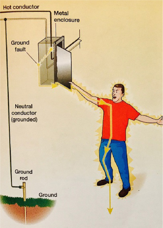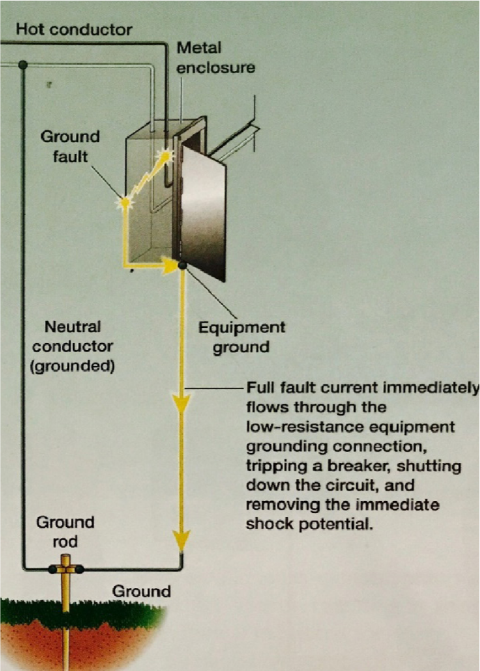 The above figure on the left shows a person getting an electric shock due to improperly grounded metal enclosure. In this illustration the ground fault has occurred. So when the person unwittingly touches it, current flows through their entire body to ground causing shock or death. The figure on the right shows a properly grounded system, with the metal enclosure connected to the ground rod by the equipment grounding conductor.