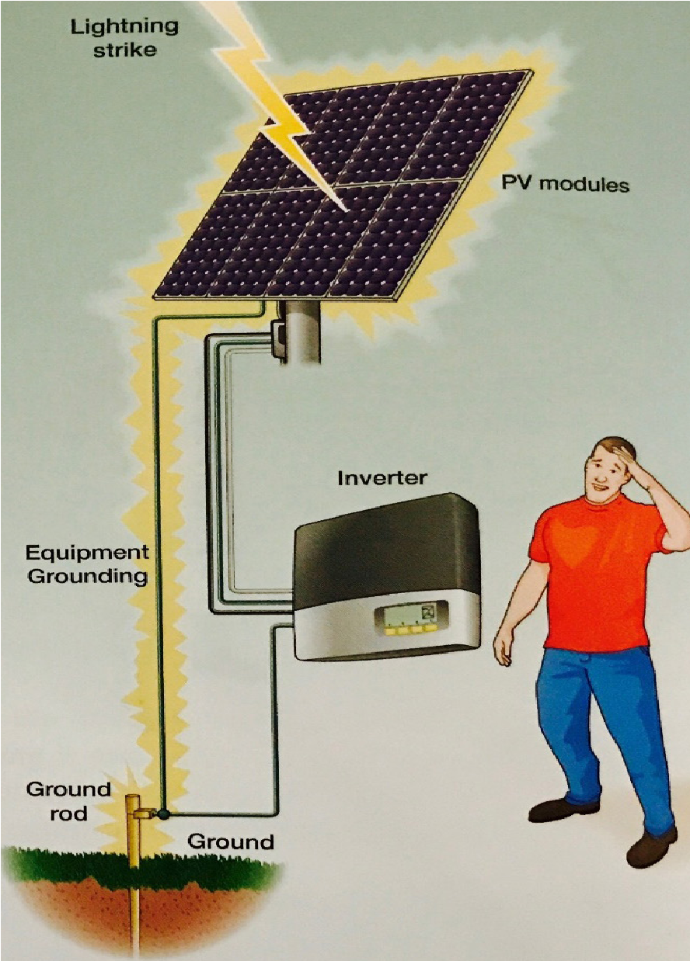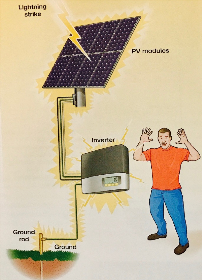 The above figure on the left shows the poor grounding that increases the risk of damage from lightning strikes. In this scenario, the only path for lightning is through the wiring from the array to the inverter and then on to ground. This can likely damage the inverter. The figure on the right shows better lightning protection with an additional array grounding electrode conductor connected directly from the PV modules to a ground rod. With this lightning arrangement, the risk of lightning damage is greatly reduced.