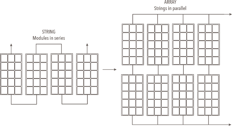 A number of PV modules connected in series is entitled a string. A string is designed such that it provides an output voltage in a range that is compatible with the solar inverter’s input voltage range. Strings are then connected in parallel in a PV plant to accomplish the desired DC capacity. The maximum allowable